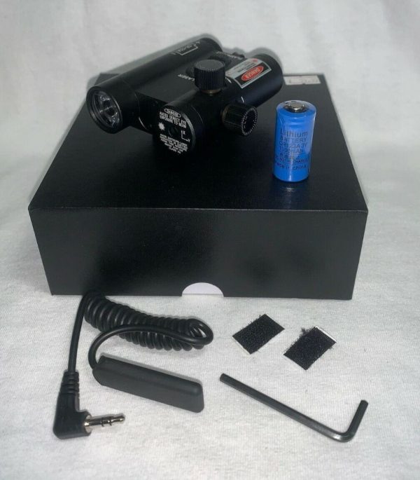 This 2-in-1 combo laser and flashlight features an outstanding 3 mode selection including; laser only, flashlight only, both laser and flashlight together. It is robust! the construction is made of aircraft-grade aluminum and is waterproof, shockproof, anti-recoil resistant and dust proof. This ambidextrous unit has conveniently located on/off push buttons on the top of the unit. It also features a fully adjustable laser that allows you to alter for wind age and elevation. To complete the set this unit also has a remote switch that can be plugged in or removed at any time, plus a battery is included. Tested on LR RIMFIRE. SPECIFICATIONS