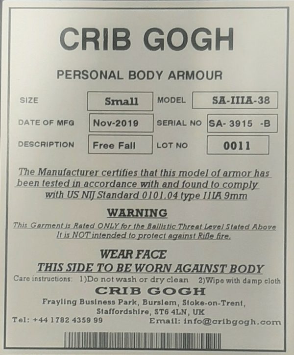 The manufacturer certifies that this model of Armor has been tested in accordance with and found to comply with US NIJ Standard 0101.04 type IIIA 9mm